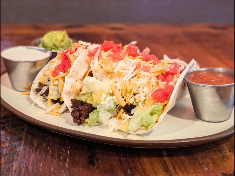 House made taco beef, crisp lettuce, fresh tomato, onion, and mixed cheese on three flour tortillas. Served with guacamole, salsa, and Mexican crema on the side.